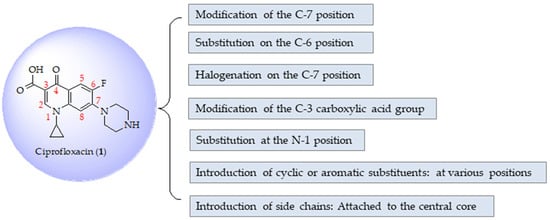 The development of ciprofloxacin derivatives has yielded molecules with a broad spectrum of pharmacological activities and minimal toxic or side effects, resulting from molecular modification for lead optimization through bioisosteric replacements, homologation of the side chain or branching of the side chain, stereochemistry, and other helpful techniques for derivative design and development. Ciprofloxacin derivatives with increased potency and activity have been reported in several publications. It has been discovered that the addition of distinct groups at position C-7 of the quinolone nucleus influences the quinolone’s potency, bioavailability, and physicochemical characteristics, in addition to its affinity for DNA gyrase (a protein found in Gram-negative bacteria) and/or Topoisomerase IV (a protein found in Gram-positive bacteria) [,]. Furthermore, adding an aryl group to the fluoroquinolone’s piperazine moiety changed its antibacterial activity to antiviral and anticancer activity []. Some studies indicate that the central 4-oxo-3-carboxylic acid structure serves as the primary binding site for DNA-gyrase, and modifying this fragment resulted in a notable reduction in antibacterial effects [,,]. The future prospects for ciprofloxacin derivatives look promising, with research focusing on novel synthesis strategies that aim to enhance their biological potency and address resistance issues. Ciprofloxacin, a widely used fluoroquinolone antibiotic, has been instrumental in treating various infections. However, the growing concern of drug resistance has driven the need for innovative approaches to develop more effective derivatives. The following section expands upon the previously discussed literature concerning modifications made to ciprofloxacin’s structure that have resulted in significantly improved biological activities.