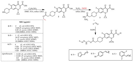 Yang et al. [] effectively synthesized twelve new fluoroquinolone derivatives by attaching N-acylarylhydrazone to ciprofloxacin at the C-7 site and evaluated their ability to inhibit the growth of selected Gram-negative and Gram-positive bacteria. The reactions involved heating solutions of ciprofloxacin and ethyl chloroacetate in dimethylformamide (DMF) in alkaline conditions, resulting in the formation of compound 2 with an 85% yield (Figure 2). Compound 2 was then treated with hydrazine hydrate under high-temperature conditions, yielding compound 3 with an 88% yield. The synthesis of the highly active hybrids 4 and 5, with respective yields of 87% and 42%, was achieved by reacting compound 3 with selected aldehydes in ethanol. The antibacterial assessment revealed that incorporating acyl hydrazone derivatives at the C-7 positions of ciprofloxacin yielded compounds with superior efficacy compared to ciprofloxacin against S. aureus. Compound 6 demonstrated a 2-fold improvement in activity compared to ciprofloxacin, exhibiting an MIC value of 0.25 μg/mL against S. aureus, while compound 5 displayed a 4-fold enhancement with an MIC value of ≤0.125 μg/mL. Notably, compound 4 exhibited the highest potency against the tested strains, with MIC values of 1 μg/mL against S. aureus and E. coli and 16 μg/mL against Pseudomonas aeruginosa. Additionally, it demonstrated anti-MRSA activity, with a MIC value of 32 μg/mL. Time–killing assays confirmed compound 4 is a promising candidate, and maintains the rapid bactericidal action of ciprofloxacin against E. coli (within 2 h) and S. aureus (within 4 h). Furthermore, cytotoxicity and hemolysis tests showed low toxicity of the compounds in vitro. Compound 4 also exhibited a high affinity for topoisomerase IV, with a binding energy of −9.9 kcal/mol, surpassing that of ciprofloxacin, according to molecular docking studies.