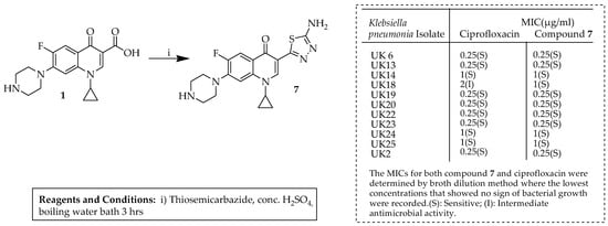 Using hybridization techniques, Osman et al. [] devised novel ciprofloxacin–1,3,4-thiadiazole hybrids and then assessed their antimicrobial efficacy through screening of the synthesized compounds against Klebsiella pneumonia isolates. Their analysis identified compound 7, characterized by its MIC value, as the most promising within the series, displaying good sensitivity across all tested strains. The highly potent compound 7 was synthesized following the procedure outlined in Figure 3. Significantly, this study identified compound 7 as pivotal to the project, as it had previously been documented in reactions involving ciprofloxacin and thiosemicarbazide in the presence of phosphorous oxychloride [,] and concentrated sulfuric acid [] and in various other techniques []. Additionally, an alternative method was reported in the literature [], which primarily substitutes phosphorous oxychloride with concentrated sulfuric acid to effectively accomplish the cyclization step. Ciprofloxacin was combined with thiosemicarbazide in concentrated sulfuric acid, followed by refluxing the mixture for 5 h in a water bath. The resultant mixture was subsequently cooled to room temperature, diluted with 10 mL of cold water, and alkalized using diluted ammonia, resulting in the formation of a precipitate, which was rinsed with water and recrystallized from ethanol. Compound 7 was obtained with a satisfactory yield of 67%. Subsequently, the authors conducted a comprehensive investigation of the compound 7 profile, including MBC, time-to-kill assays, and resistance development. The results indicate that while hybridization prolonged the action of compound 7 and reduced drug resistance compared to the parent drug, ciprofloxacin, it also delayed its onset due to increased lipophilicity. Furthermore, molecular docking suggested that the inclusion of a thiadiazole ring facilitated interactions with DNA gyrase similar to those of the parent ciprofloxacin. Lastly, in silico physicochemical and pharmacokinetic studies predicted compound 7 as a promising antibiotic.