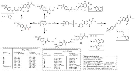 Ibrahim and co-authors [] used the hybridization strategy to develop various ciprofloxacin–sulfonamide hybrid molecules based on six sulfonamides (sulfaguanidine, sulfaclozine, sulfaquinoxaline, sulfadiazine, sulfanilamide, sulfaclozine, and sulfamethoxazole). The authors developed ciprofloxacin–sulfonamide hybrids with different linkers. The methods used to produce these hybrids are illustrated in Figure 4. The initial set, represented by compounds 9 and 10, used a diazenyl linker and was synthesized by reacting ciprofloxacin with the diazonium salt of specific sulfonamides (8) at a pH of 6. Subsequently, compounds 12–15, and 18, which employed acetamide, 3-propanamide, and 2-propanamide linkers, respectively, were synthesized following the schemes outlined in Figure 4. Initially, these compounds were synthesized by acylating appropriate sulfonamides 8 with corresponding chloroacyl chloride in dry DMF. The resultant acyl derivatives 11, 16, and 17 were obtained with high yields (81.4–87.57%) under mild conditions, at room temperature without the necessity of a catalyst. These acyl derivatives were then subjected to reaction with ciprofloxacin in DMF, using reflux heating in the presence of triethylamine (TEA) as a basic catalyst. The compounds were assessed for their ability to inhibit DNA topoisomerase IV and DNA gyrase in vitro. Five ciprofloxacin–sulfonamide hybrids (12–15 and 18) demonstrated strong inhibitory effects against DNA topoisomerase IV, with IC50 values ranging from 0.23 to 0.44 µM. Similarly, three hybrids (12–14) efficiently inhibited DNA gyrase, with IC50 values ranging from 0.43 to 1.1 µM. Moreover, all synthesized hybrids were tested for their MICs against both Gram-positive and Gram-negative pathogens, including S. aureus Newman and E. coli ATCC8739. Compounds 9 and 10 exhibited significantly improved antibacterial activity compared to ciprofloxacin, with MIC values of 0.324 and 0.422 µM against S. aureus Newman and 0.013 µM against E. coli ATCC8739. Subsequently, compounds 9, 12, 14, and 18, identified as potent inhibitors, were evaluated in vivo for CNS side effects, showing no mortality or reduced incidence of convulsions compared to the reference drug. Western blot tests indicated lower GABA (the neurotransmitter Gamma-Aminobutyric Acid) expression for these compounds compared to ciprofloxacin, suggesting minimal CNS side effects. Additionally, a molecular docking study revealed that the hybrid compounds bind similarly to ciprofloxacin, with the sulfonamide moiety occupying an extended pocket for the bulky C-7 substituent.
