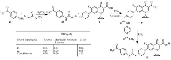 A ciprofloxacin hybrid, 22, was designed and synthesized by Elgedamy et al. [] by acetylating/alkylating ciprofloxacin and then thioamidation on its matching amide, 21. The desired hybrid molecules were synthesized according to the procedure described in Figure 5. Initially, the acetylated amine 20 was synthesized through a biphasic reaction involving bromoacetyl bromide. Subsequent refluxing of 20 with ciprofloxacin in a basic environment resulted in the production of amide 21 with a favorable yield (54.50%). Thioamidation of 21 was achieved by utilizing phosphorus pentasulfide in dioxane, yielding a 40.50% moderate yield of thioamide 22. Both compounds 21 and 22 underwent screening to assess their antibacterial effects against various bacterial strains, including S. aureus, MRSA, and E. coli. Additionally, their antifungal properties were tested against Candida albicans. The amide derivative exhibited potent antibacterial efficacy against all the tested strains compared to the original antibiotic, ciprofloxacin. Conversely, thioamide demonstrated robust antifungal activity and moderate antibacterial effects against Gram-negative bacteria (E. coli) and Gram-positive bacteria (S. aureus, MRSA) when compared to ciprofloxacin. The introduction of a bulky functional group at the C-7 position of ciprofloxacin significantly affected its effectiveness against bacteria, its spectrum, and its safety profile. The addition of an amide group primarily enhanced the antibacterial properties, and the incorporation of a thioamide group predominantly enhanced the antifungal activity, although it also altered the antibacterial efficacy against certain bacterial strains. This suggests that the release of H2S plays a more substantial role in enhancing antifungal effects compared to antibacterial effects.