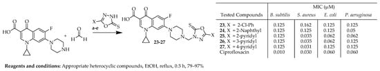 Al-Wahaibi et al. [] developed a novel class of ciprofloxacin hybrid molecules made up of different heterocycle derivatives, which were tested in vitro against both Gram-negative and Gram-positive bacterial strains, such as E. coli and P. aeruginosa, as well as S. aureus and B. subtilis. Compounds 23–27, which are oxadiazole derivatives, exhibited antibacterial effectiveness ranging from 88% to 120% compared to ciprofloxacin against both Gram-positive and Gram-negative bacteria. It is notable that compound 27 exhibited greater efficacy (120%) against S. aureus compared to ciprofloxacin. Oxadiazoles 25 and 26 demonstrated comparable effectiveness to ciprofloxacin against both S. aureus and E. coli. Based on prior research results, incorporating oxadiazole and thiadiazole groups into a compound provided enhanced effectiveness. The synthetic strategy for synthesizing compounds 23–27 is detailed in Figure 6, and the previously mentioned intermediates a–e were produced as described in previous studies []. As depicted in Figure 6, ciprofloxacin reacts through a Mannich reaction with heterocycles a–e and formaldehyde in ethanol at reflux temperature, producing the desired compounds 23–27 in good yields varying from 85 to 96%.