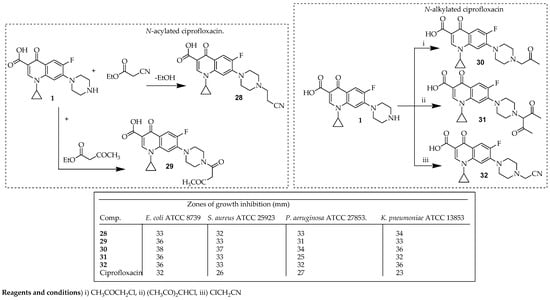 Alsughayer et al. [] developed novel derivatives of ciprofloxacin using various organic reagents and evaluated their efficacy against diverse microorganisms. Ciprofloxacin underwent acylation via a reaction with ethyl cyanoacetate and ethyl acetoacetate under basic conditions, yielding the cyanacetylpiprazinyl dihydroquinoline derivative 28 and the oxobutanoylpiprazinyl dihydroquinoline derivative 29, respectively. Conversely, N-alkylated derivatives 30–32 were synthesized by reacting ciprofloxacin with chloroacetonitrile, chloroacetyl acetone, and chloroacetone in the presence of carbonate salt, as illustrated in Figure 7. Compounds 28–32 demonstrated notable efficacy against E. coli (ATCC 8739). Overall, their efficacy surpassed that of ciprofloxacin discs (5 μg, Oxoid.com), indicating the impact of the modifications made at C-7. Compound 30 exhibited the most significant effect, followed by 29–32 (which exhibited similar effects), and, finally, Compound 28. Similarly, the impact of compound 30 on S. aureus (ATCC 25923) was highly effective, followed by compounds 28, 30, and 31 (which exhibited similar effects). All these derivatives displayed significant efficacy against S. aureus (ATCC 25923), surpassing the effects of the commercial ciprofloxacin disc (5 μg) sample. Moreover, compound 30 exhibited potent activity against P. aeruginosa (ATCC 27853). The efficacies of the modified ciprofloxacin derivatives against P. aeruginosa (ATCC 27853) can be ranked as follows: 30 > 28 > 32 > 29 > Ciprofloxacin disc > 31. For P. aeruginosa ATCC (27853) and K. pneumoniae ATCC 13853, compound 28 exhibited a significant effect, following compound 30; this could have occurred due to the formation of a quaternary ammonium salt. This finding aligns with findings documented in a recent study [].