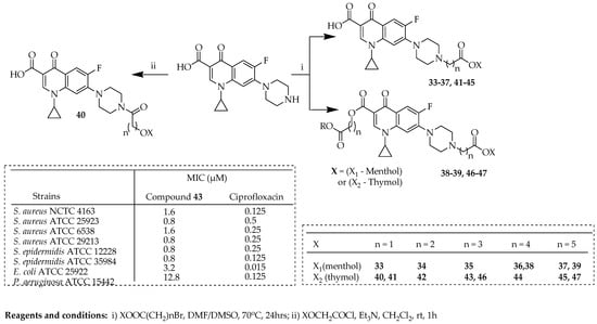 The research carried out by Szostek et al. [] reported ciprofloxacin derivatives containing menthol and thymol scaffolds (Figure 8), subsequently evaluating them for their antimicrobial properties. These compounds were synthesized using various carboxylic linkers. They believed that linking molecules with antimicrobial properties, distinct from ciprofloxacin in their modes of action, could potentially enhance pharmacological properties or contribute to reducing bacterial resistance. Modifications made to the reaction protocol enabled the synthesis of three variations of derivatives containing a chain-extending linker connected to the piperazinyl moiety (C-7) of ciprofloxacin, ranging from acetyl to hexyl substitutions. Alongside the target primary compounds, disubstituted derivatives 38, 39, 46, and 47 were obtained. For instance, compound 37 was obtained as the primary product with an 85% yield, while a secondary product, compound 39, resulting from a concurrent reaction with the ciprofloxacin carboxylic group, was isolated with an 8% yield. Amongst these new ciprofloxacin derivatives, compound 43, which was hybridized with thymol, was significantly effective against various Gram-positive Staphylococci strains, with MIC values between 0.8 and 1.6 µg/mL. It was identified as the most potent compound, with MIC values of 1 µg/mL for clinical strains of Staphylococcus pasteuri KR 4358 and S. aureus (T 5591). All compounds with single substitutions displayed a wide range and potent spectrum of activity. Modification via the 4-oxo-3-carboxylic acid core of ciprofloxacin led to a reduction in its antimicrobial effectiveness.