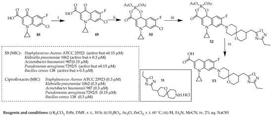 Lukin et al. [] investigated the potential use of spirocyclic piperidines for developing derivatives of ciprofloxacin. By employing a halogen-substituted fluoroquinolone core, 36 new ciprofloxacin derivatives were synthesized and evaluated against a combination of two types of Gram-positive bacteria and three types of Gram-negative bacteria. Among these derivatives, compound 53 (Figure 9) stood out as the one showing activity against all five strains. This compound was synthesized by esterification of a commercially accessible 7-chloro-1-cyclopropyl-6-fluoro-4-oxo-1,4-dihydroquinoline-3-carboxylic acid (48) to produce ester 49. This ester was then transformed into boron chelation complex 50 using established methodologies [,,], wherein the chlorine at position C-7 displayed enhanced reactivity in nucleophilic aromatic substitution reactions. Heating compound 50 with spirocyclic piperidines (51) at 60 °C alongside TEA prompted the desired substitution. The boron chelation complex was subsequently eliminated by treating intermediates (52) with a 2% aqueous sodium hydroxide solution, resulting in the production of fluoroquinolones (53) in yields ranging from moderate to nearly complete. The antibacterial effects of the newly synthesized spirocyclic compounds were notably influenced by the peripheral groups in 1-oxa-9-azaspiro. Overall, this new series of compounds demonstrated significant activity against two specific strains: the Gram-negative Acinetobacter baumannii 987® and the Gram-positive Bacillus cereus 138®. Some of these compounds exhibited equal or greater potency compared to ciprofloxacin against these strains.