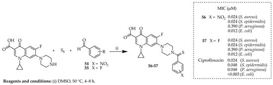 Pedrood and colleagues [] synthesized a novel series of N-thioacylated derivatives of ciprofloxacin using a Willgerodt–Kindler-type reaction at a moderate temperature without the need for a catalyst. The reaction outlined in Figure 10 illustrates the synthetic strategy used to synthesize N-thioacylated ciprofloxacin derivatives 56–57. Commercial ciprofloxacin underwent thioamidation with different aldehydes (54–55) in the presence of sulfur (S8) in equivalent amounts, resulting in the respective end products 56–57. Initially, the secondary amine group of ciprofloxacin underwent a nucleophilic attack on elemental cyclooctasulfur (S8), leading to cleavage of the S–S bond and the reversible formation of polysulfide anion II. Concurrently, various aldehydes (54–55) reacted with another molecule of ciprofloxacin to generate the intermediate iminium ion III by eliminating the hydroxyl group. The interaction between intermediates II and III then resulted in the formation of IV, which was subsequently oxidized to produce products 56–57.
