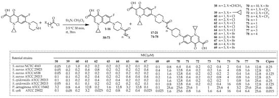 Synthetic strategy and the antibacterial outcomes of ciprofloxacin derivatives (58–78).