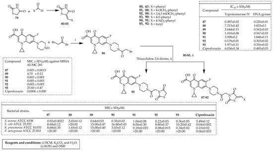 Aziz and colleagues [] synthesized a series of hybrids combining ciprofloxacin with thiazolidine-2,4-dione. The compounds 87–93 were prepared according to the procedure outlined in Figure 12. Thiazolidine-2,4-dione was synthesized by heating chloroacetic acid and thiourea, as previously described []. Acylated ciprofloxacin was obtained by reacting ciprofloxacin with bromoacetyl bromide in the presence of potassium carbonate []. Derivatives 80–85 of 5-benzylidene thiazolidine-2,4-dione were synthesized via Knoevenagel condensation of different aromatic aldehydes in glacial acetic acid with anhydrous sodium acetate as a catalyst []. The target compounds 87–93 were then prepared by alkylating compounds 80–85 with acylated ciprofloxacin 1 in DMF with potassium hydroxide (KOH) as the base. The evaluation of their antibacterial effects demonstrated a shift towards combating Gram-positive bacteria. Compounds 87–93 displayed significant activity against S. aureus ATCC 6538, with MIC values ranging from 0.02 to 0.36 µM, compared to ciprofloxacin (MIC = 5.49 µM). These compounds also exhibited promising activity against MRSA AUMC 261, with 87, 88, and 92 displaying MIC values of 5 nM. However, their effectiveness against Gram-negative bacteria was reduced, although compound 92 showed a slightly enhanced activity against K. pneumoniae ATCC10031 (MIC = 0.08 µM). The incorporation of the thiazolidine-2,4-dione ring into ciprofloxacin preserved its capability to inhibit DNA synthesis by targeting both topoisomerase IV and the DNA gyrase of S. aureus. Compounds 87, 92, and 93 exhibited greater potency than ciprofloxacin in inhibiting topoisomerase IV (IC50 = 0.3–1.9 μM) and gyrase (IC50 = 0.22–0.31 µM), which correlated with their antibacterial activity against S. aureus ATCC 6538. Molecular docking against the DNA gyrase active site confirmed the compounds’ ability to form stable complexes with the enzyme, suggesting that 87, 90, 91, 93, and 92 represent promising broad-spectrum antibacterial agents with good capability to target topoisomerase IV and gyrase enzymes to produce notable efficacy against MRSA.