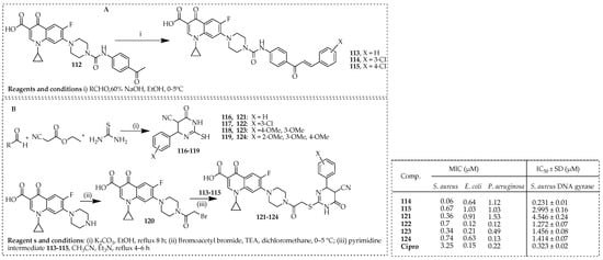 Synthetic strategy and the antibacterial outcomes of ciprofloxacin derivatives (113–115 (A) and 121–124 (B)).