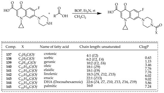 Given the features of natural fatty acids like biocompatibility, biodegradability, and enhanced cellular absorption by cancer cells, Chrzanowska et al. [] hypothesized that linking them with ciprofloxacin will enhance their bioavailability and boost their cytotoxic potential. Ciprofloxacin was hybridized with either saturated or unsaturated fatty acids, as illustrated in Figure 17. Their impact on cytotoxicity, ability to induce apoptosis, and inhibition of IL-6 release across human primary (SW480) and metastatic (SW620) colon cancer, metastatic prostate cancer (PC3), and normal (HaCaT) cell lines were evaluated. The acyl groups introduced encompassed both unsaturated (137–144) and saturated (145) varieties, spanning short-chain (137, 138), middle-chain (139), and long-chain (140–145) components. Certain members exhibited geometric E-isomerism (137–139 and 141), while others constituted naturally occurring Z-isomers (140 and 145–147). The synthesis occurred under mild conditions at room temperature, yielding good results. To ensure structural diversity, acids of varying chain lengths, degrees of unsaturation, and geometric isomerism were deliberately selected. The PC3 cell lines exhibited the highest sensitivity to the tested conjugates. Conjugate 140, composed of oleic acid, demonstrated an IC50 value of 7.7 mM, significantly lower compared to ciprofloxacin alone (101.4 mM), indicating a 12-fold decrease in potency. These derivatives induced late apoptosis in all cancer cell lines with no notable effect on normal cells. Conjugate 140 emerged as the most potent apoptosis inducer, with 81.5% ± 3.9 of PC3 cells undergoing late apoptosis, followed closely by elaidic acid amide (141) at 75% ± 4.8. Among the studied derivatives, DHA (144) and sorbic (138) acid conjugates exhibited the strongest proapoptotic effects on SW480 cells, whereas compounds 138 and 141 showed remarkable efficacy in SW620 cell lines. To elucidate the cytotoxic mechanism of derivatives 128, 140, and 141, interleukin-6 (IL-6) levels were measured, revealing a significant decrease in IL-6 release by cancer cells treated with the most cytotoxic conjugates. Additionally, all conjugates were assessed for in vitro antimicrobial activity, with crotonic (137) and sorbic (138) short-chain amides demonstrating potent activity against Staphylococci. Notably, sorbic acid amide (138) exhibited strong antimicrobial and antitumor properties, highlighting its dual functionality.