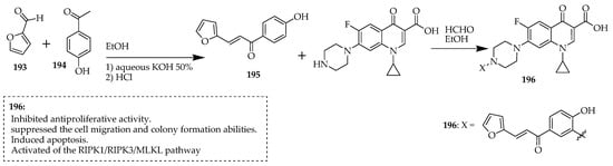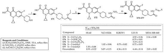 Kassab et al. [] developed compounds with both anticancer and antibacterial properties. They utilized a biology-oriented drug synthesis approach to produce a range of new ciprofloxacin hybrid molecules. The reaction for synthesizing the desired compounds is described in Figure 19. The initial compound, 170, was synthesized through the reaction between ciprofloxacin and ethyl chloroacetate in DMF. Compound 170 was reacted with hydrazine hydrate to yield compound 172. The hydrazones 173–177 were synthesized by treating compound 172 with the respective aldehyde in ethanol. Some of the compounds were further investigated to determine their IC50 values against the most responsive cancer cell lines. In vitro experiments revealed that these five compounds displayed significant anticancer efficacy against the tested cell lines within the nanomolar to micromolar range, with IC50 values ranging from 0.72 to 4.92 mM. This potency ranged from 9 to 1.5 times greater than that of doxorubicin. Compounds 174 and 176 emerged as promising potent anticancer hybrids, demonstrating a strong correlation between their antiproliferative activity and their ability to inhibit topoisomerase II (with IC50 values of 0.58 and 0.86 mM, respectively). Compound 174 exhibited a 6-fold greater potency than doxorubicin, a 5-fold greater potency than amsacrine, and a 1.5-fold greater potency than etoposide. Similarly, compound 176 showed a four-fold stronger inhibition of topoisomerase II compared to doxorubicin, a three-fold greater potency than amsacrine, and nearly equivalent activity to etoposide. Activation of the DNA damage response pathway led to cell cycle arrest at the G2/M phase, accumulation of cells in the pre-G1 phase, and annexin-V and propidium iodide staining, indicating apoptosis as the mode of cell death. Furthermore, compounds 174 and 176 exhibited potent proapoptotic effects through induction of the intrinsic mitochondrial pathway of apoptosis, as evidenced by a significant increase in active caspase-3 levels compared to the controls. This suggests that both ciprofloxacin hybrids may chelate with zinc, a potent inhibitor of procaspase-3 enzymatic activity, thereby facilitating the processing of procaspase-3 into its active form. The newly synthesized ciprofloxacin derivatives were evaluated in vitro for their antibacterial effectiveness against B. subtilis, S. aureus, E. coli, and P. aeruginosa strains. The findings demonstrated that all tested compounds exhibited significant antibacterial properties, ranging from good to excellent, in comparison to ciprofloxacin. Notably, compound 177 displayed greater potency than ciprofloxacin, specifically against P. aeruginosa, a prevalent pathogen responsible for infections in patients with granulocytopenic cancer.