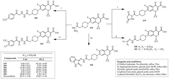 Swedan et al. [] developed novel ciprofloxacin derivatives containing biologically active groups substituted at the C-7 position. Compound 178 was synthesized by a procedure outlined by Kassab et al. []. Compound 179 was synthesized by reacting compound 178 with diethyl malonate in the presence of sodium ethoxide (Figure 20). The hydrazones 180 and 181 were obtained through the reaction of compound 178 with the appropriate ketone in ethanol with glacial acetic acid. Compound 182 was obtained by refluxing compound 178 with the suitable isatin in absolute ethanol with glacial acetic acid. Compound 183 was prepared by reacting compound 178 with the appropriate phenyl isocyanates or phenyl isothiocyanate in absolute ethanol with glacial acetic acid. Ciprofloxacin derivative 184 was prepared by reacting compound 178 with phenacyl bromide in dry benzene with potassium carbonate.