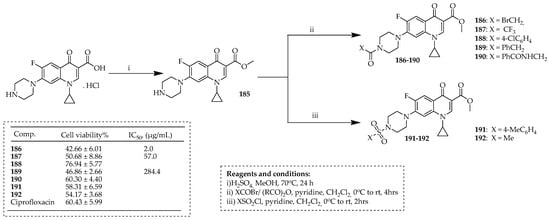 Akhtar et al. [] synthesized some novel N-acylated ciprofloxacin-based pharmacophores by reacting various sulfonyl halides and carboxylic acids, or acyl, with ciprofloxacin methyl ester. They started with commercially available ciprofloxacin and easily synthesized methyl ester 185 (70%) through Fischer esterification. N-Acylation of ciprofloxacin ester 185 using trifluoroacetic anhydride or acyl and sulfonyl halides in DCM with pyridine yielded the respective N-acylated ciprofloxacin analogues 186, 187 (67% and 85%, respectively), 191, and 192 (66% and 68%, respectively) [,,]. Additionally, a range of carboxylic acids were reacted with DCC, employing ciprofloxacin ester 185, resulting in targeted compounds 188–190, with yields ranging from 77% to 87% (Figure 21). The findings indicated a decreased cell viability for compounds 186, 187, and 189 (42.66%, 50.68%, and 46.86%, respectively) at a concentration of 100 μg/mL. The half-maximal inhibitory concentration values (IC50) revealed the significance of 186, demonstrating superior cytotoxicity compared to other synthesized derivatives with an IC50 value of 2.0 μg/mL. The presence of a good leaving group (Br) suggests that compound 186 holds promise for generating various N or S-alkylated ciprofloxacin derivatives with enhanced anticancer properties in future studies. The use of computational modeling (in silico) for compound 186 (with an IC50 of 2.0 μg/mL) provided additional clarity on its potential as an anticancer agent. Molecular docking studies showed that compound 186 exhibits a greater affinity for inhibiting topoisomerase II than ciprofloxacin.