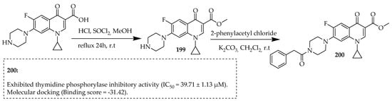 - Shahzad, S.A.; Sarfraz, A.; Yar, M.; Khan, Z.A.; Naqvi, S.A.R.; Naz, S.; Khan, N.A.; Farooq, U.; Batool, R.; Ali, M. Synthesis, evaluation of thymidine phosphorylase and angiogenic inhibitory potential of ciprofloxacin analogues: Repositioning of ciprofloxacin from antibiotic to future anticancer drugs. Bioorg. Chem. 2020, 100, 103876. [Google Scholar] [CrossRef] [PubMed]