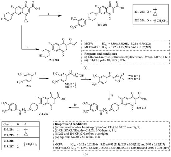 - Ahadi, H.; Emami, S. Modification of 7-piperazinylquinolone antibacterials to promising anticancer lead compounds: Synthesis and in vitro studies. Eur. J. Med. Chem. 2020, 187, 111970. [Google Scholar] [CrossRef]