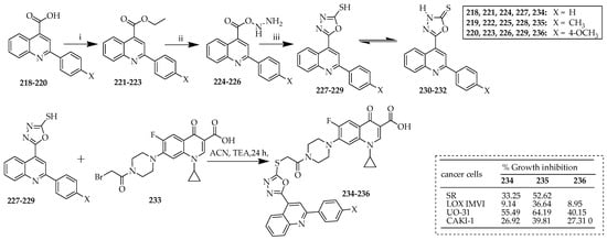 Ahadi et al. [] modified the 3-carboxylic functionality of the ciprofloxacin structure to change its activity from antibacterial to anticancer activity. Therefore, a series of C-3-modified ciprofloxacin derivatives with an N-(5-(benzylthio)-1,3,4-thiadiazol-2-yl)-carboxamide moiety were successfully synthesized. Figure 18 illustrates a series of reactions employed for synthesizing innovative quinolone-based thiadiazoles. Initially, 5-amino-1,3,4-thiadiazole-2-thiol (147) was synthesized through the heterocyclization of thiosemicarbazide (146) using carbon disulfide and KOH in absolute ethanol. Compound 147 was then reacted with benzyl chloride or bromide derivatives to yield S-benzyl derivatives, 148–154, in good yields. Conversely, to modify the 3-carboxylic acid functionality of ciprofloxacin, the NH of the piperazinyl group underwent protection with a tert-butyloxycarbonyl (Boc) group. This involved treating ciprofloxacin with Boc2O in the presence of sodium bicarbonate in THF-H2O, resulting in N-Boc-ciprofloxacin (155). To activate the 3-carboxylic acid, compound 155 was treated with ethyl chloroformate and TEA as a base in dry DCM to yield intermediate 156. The reaction of compound 156 with aminothiadiazoles 148–154 produced the corresponding amides 157–163. Finally, deprotection of the N-Boc-amides (157-163) with TFA in DCM at room temperature generated compounds 164–170.