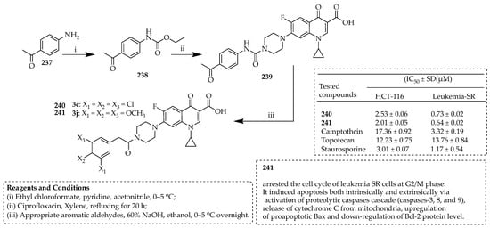 - Kassab, A.E.; Gedawy, E.M. Novel ciprofloxacin hybrids using biology-oriented drug synthesis (BIODS) approach: Anticancer activity, effects on cell cycle profile, caspase-3 mediated apoptosis, topoisomerase II inhibition, and antibacterial activity. Eur. J. Med. Chem. 2018, 150, 403–418. [Google Scholar] [CrossRef]