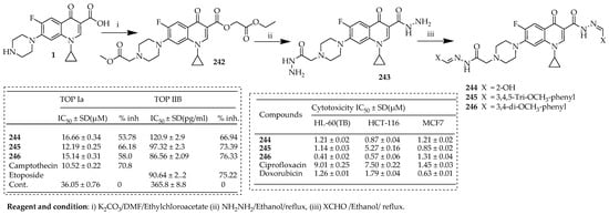 - Samir, M.; Ramadan, M.; Abdelrahman, M.H.; Abdelbaset, M.S.; Abourehab, M.A.S.; Abdel-Aziz, M.; Abuo-Rahma, G.E.-D.A. 3,7-bis-benzylidene hydrazide ciprofloxacin derivatives as promising antiproliferative dual TOP I & TOP II isomerases inhibitors. Bioorg. Chem. 2021, 110, 104698. [Google Scholar]