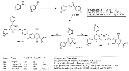 - Alavala, R.; Kulandaivelu, U.; Bonagiri, P.; Boyapati, S.; Jayaprakash, V.T.; Subramaniam, A. Synthesis and Antiviral Activity of Dihydropyrimidines-Ciprofloxacin Mannich bases against Various Viral Strains. Anti-Infect. Agents 2015, 13, 154–165. [Google Scholar] [CrossRef]
