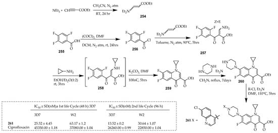 The diverse pharmacological effects of ciprofloxacin have been explored in several studies, including its potential anti-TB [,,,], antifungal [,,], antiviral [,,,], antimalarial [], and antitumor activities []. Due to its exceptional pharmacological activities, the synthesis of ciprofloxacin derivatives has recently received extensive attention []. The development of new drugs with promising clinical applications and novel mechanisms of action is difficult, expensive, and time-consuming. Numerous researchers employ a budget-friendly strategy to enhance therapeutic effectiveness by modifying existing drugs rather than pursuing the expensive route of developing new therapeutics and subjecting them to clinical testing. The foundational method for drug discovery involves employing structure–activity relationships of lead compounds, like already existing drugs, to produce analogues that offer enhanced therapeutic properties [,]. Ciprofloxacin derivatives have demonstrated a range of pharmacological potentials, including anticancer, antibacterial, antimicrobial, antimalarial, and antiviral properties [,,,,]. In 2013, Castro et al. [] reported several ciprofloxacin derivatives with potential medicinal applications. The current review focuses on recent advancements in synthetic strategies and potential pharmacological activities of ciprofloxacin derivatives.