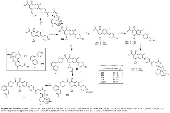 - Dana, S.; Valissery, P.; Kumar, S.; Gurung, S.K.; Mondal, N.; Dhar, S.K.; Mukhopadhyay, P. Synthesis of Novel Ciprofloxacin-Based Hybrid Molecules toward Potent Antimalarial Activity. ACS Med. Chem. Lett. 2020, 11, 1450–1456. [Google Scholar] [CrossRef] [PubMed]