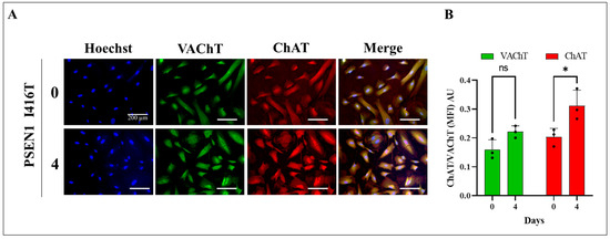 PSEN1 I416T MenSCs transdifferentiated into cholinergic-like neurons (ChLNs) express cholinergic markers choline acetyltransferase (ChAT) and vascular acetylcholine transporter (VAChT). PSEN1 I416T MenSCs were cultured with cholinergic differentiation Ch-N-Run medium for 7 days as described in the Materials and Methods section. Subsequently, they were left in regular culture medium (RCm) for 0 and 4 days. (A) Representative fluorescence microscopy photographs showing cholinergic ChAT (red fluorescence) and VAChT (green fluorescence) in ChLNs cultured in RCm for 0 and 4 days post-transdifferentiation. The nuclei were stained with Hoechst 33342 (blue). (B) Mean fluorescence intensity (MFI) quantification of images of ChAT (red fluorescence) and VAChT (green fluorescence) in ChLNs obtained by immunofluorescence analysis. The figures represent 1 out of 3 independent experiments. One-way ANOVA, post hoc test Bonferroni. Data are presented as mean ± SD, * p < 0.05, ns = no significance. Image magnification, 200×.