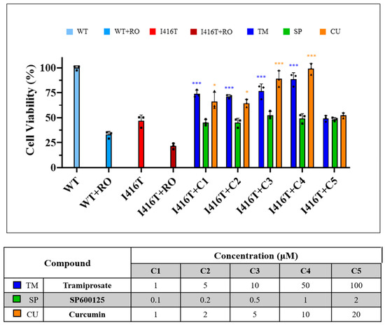 Effect of tramiprosate (TM), SP600125 (SP), and curcumin (CU) alone or combination on I416T ChLNs.