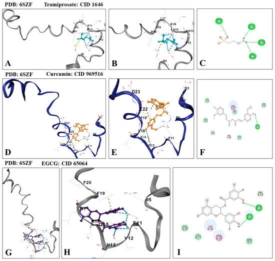 In silico molecular docking analysis of Aβ (PDB: 6SZF) with tramiprosate, curcumin, or epigallocatechin 3-gallate (EGCG).