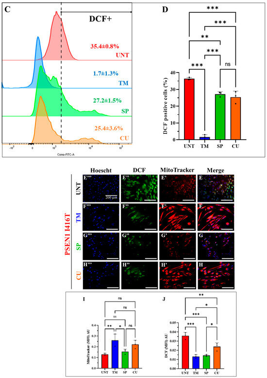 PSEN1 I416T cholinergic-like neurons (ChLNs) exposed to TM and CU showed high mitochondrial membrane potential (ΔΨm) and exhibited low levels of intracellular reactive oxygen species (ROS). PSEN1 I416T MenSCs were cultured in a cholinergic differentiation medium for 7 days as described in the Materials and Methods section. Thereafter, PSEN1 I416T ChLNs were left in regular culture medium (RCm) for 4 days exposed to TM (50 μM), SP (1 μM), and CU (10 μM). (A) Representative flow cytometry histogram showing the percentage decrease in ΔΨm. (B) Quantification of the percentage of mitoTracker-positive cells. (C) Representative flow cytometry histogram showing DCF-positive cells. (D) Quantification of DCF fluorescence intensity. (E–H) Merge fluorescence microscopy images showing triple staining with MitoTracker™ Red FM (red fluorescence, E′–H′), DCF (green fluorescence, E″–H″), and Hoechst 33342 (blue, E‴–H‴). (I) Quantification of ΔΨm by fluorescence intensity. (J) Quantification of DCF fluorescence intensity. The figures represent 1 out of 3 independent experiments. One-way ANOVA followed by Tukey’s test. Statistically significant differences: * p < 0.05, ** p < 0.01, *** p < 0.001, and ns = no significance. Image magnification, 200×. Figures and photomicrographs represent one out of three independent experiments (n = 3). The data are presented as mean ± SD of three independent experiments.