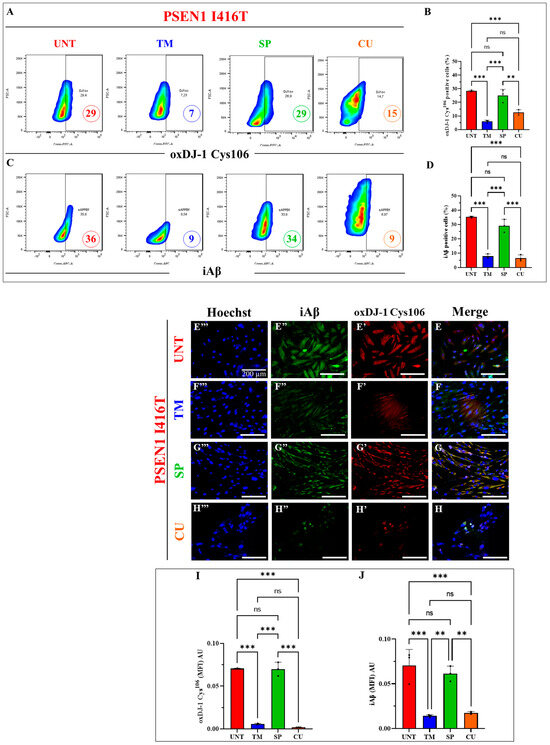 It is well established that the ROS, i.e., H2O2, specifically oxidizes the residue Cys106SH (sulfhydryl group) of the stress sensor protein DJ-1 into DJ-1-Cys106SO3 (sulfonic group, [66]). Since DJ-1-Cys106-SO3 constitutes a biomarker of cellular OS [67], we wanted to confirm that mutant cholinergic neurons endogenously produce H2O2 (ROS), thereby displaying DJ-1-Cys106SO3 [33], and to test whether the reagents individually interfere with such oxidation. As shown in Figure 6, mutant ChLNs display 29% oxidized DJ-1-positive cells according to a flow cytometry assay (Figure 6A,B). TM and CU treatment reduced oxDJ-1 by −76% and −48%, respectively, whereas no significant change in oxDJ-1 was induced by the inhibitor SP (Figure 6A,B). On the other hand, PSEN1 I416T effectively accumulated iAβ by 36%. TM and CU treatment dramatically reduced the accumulation of iAβ by −75%, whereas no statistical differences were observed with SP treatment compared to untreated cells (Figure 6C,D). Similar data were obtained by fluorescence microscopy analysis (Figure 6E–J).