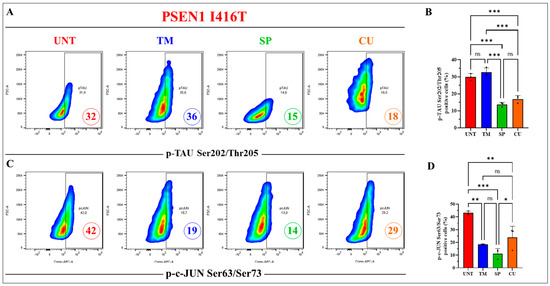 2.5. Tramiprosate (TM), Curcumin (CU), and SP600125 (SP) Differentially Decrease Phosphorylation of Protein TAU and Transcription Factor c-JUN in PSEN 1 I416T ChLNs