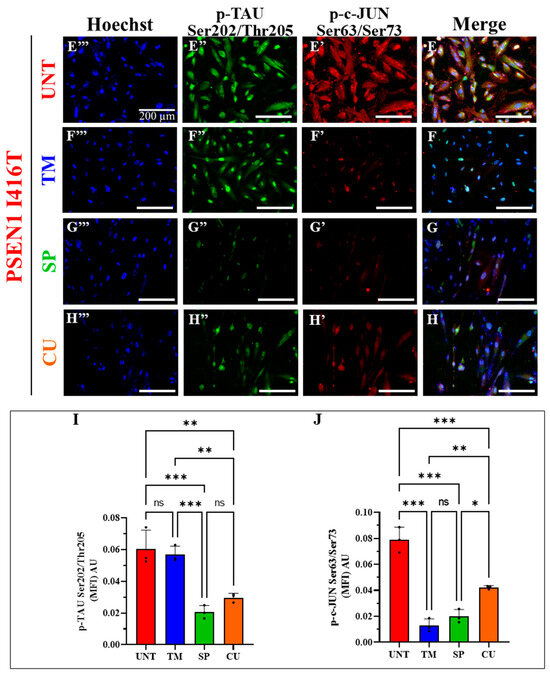 PSEN1 I416T cholinergic-like neurons (ChLNs) treated with SP and CU display reduced phosphorylation of protein TAU and c-JUN. PSEN1 I416T MenSCs were cultured for 7 days in a cholinergic differentiation medium following the protocols outlined in the Materials and Methods section. Subsequently, PSEN1 I416T ChLNs underwent a 4-day culture in standard culture medium (RCm) supplemented with TM (50 μM), SP (1 μM), and CU (10 μM). (A) Representative flow cytometry density plots illustrating phosphorylated TAU (p-TAUSer202/Thr205). (B) Quantification of the percentage of cells exhibiting p-TAUSer202/Thr205-positive staining. (C) Representative density plot from flow cytometry data showing phosphorylated c-JUN (p-c-JUNSer63/Ser73). (D) Quantification of the percentage of p-c-JUNSer63/Ser73-positive cells. (E–H) Merge fluorescence microscopy imagine showing double staining with antibodies specific for p-c-JUNSer63/Ser73 (red, E′–H′) and p-TAUSer202/Thr205 (green, E″–H″). Nuclei were stained with Hoechst 33342 (blue, E‴–H‴). (I) Mean fluorescence intensity (MFI) for p-TAU Ser202/Thr205. (J) Mean fluorescence intensity (MFI) for p-c-JUNSer63/Ser73. Figures and micrographs represent one out of three conducted experiments. The results are reported as the mean ± standard deviation of 3 independent experiments. A one-way ANOVA, followed by Tukey’s test, was conducted for statistical analysis. Statistically significant variations are indicated by * p < 0.05, ** p < 0.01, *** p < 0.001, and ns = no significance. The images were magnified at 200×.