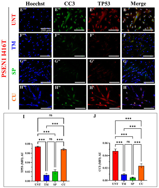 Next, we wanted to determine whether TM, CU, and SP could modulate the expression of apoptogenic protein TP53 and activation of CASP3 (i.e., cleaved caspase 3, CC3) as observed in PSEN1 I416T ChLNs [33]. Figure 8 shows that all three agents affected the expression of TP53, albeit with different strengths. While TM and SP reduced TP53 to 12% (−54%) and 18% (−31%) compared to untreated cells (26%), CU slightly increased TP53 to 31% (+19%, Figure 8A,B). Interestingly, all three agents consistently reduced CC3. TM, SP, and CU abridged CC3 by −74%, −91%, and −41% (Figure 8C,D). Similar results were obtained by immunofluorescence microscopy (Figure 8E–J).