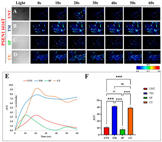 PSEN1 I416T ChLNs treated with CU or TM exhibit an increase in functional response to acetylcholine (ACh). After 7 days of transdifferentiation, PSEN1 I416T ChLNs were cultured in regular culture medium for 4 days and treated with one of the following substances: TM (50 μM), SP (1 μM), and CU (10 μM), as indicated in the figure. ACh was puffed into the culture at 0s (arrow). Then, the Ca2+ fluorescence of the cells was monitored at the specified times. Color contrast indicates fluorescence intensity: dark blue < light blue < green < yellow < red. Representative time-lapse images (0, 10, 20, 30, 40, 60 s) of Ca2+ fluorescence in response to ACh in PSEN1 I416T ChLNs after 4 days of (A) untreated conditions or treatment with (B) TM, (C) SP, (D) CU. (E) Graph showing ΔF/F and (F) area under the curve (AUC) of cells with and without treatment. The figures represent 1 out of 3 independent experiments. Data are expressed as the mean ± SD; *** p < 0.001, ns = no significance. Image magnification, 200×.