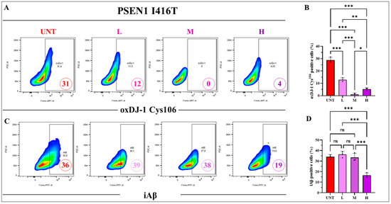 PSEN 1 I416T ChLNs treated with the combination of TM, CU, and SP at low (5, 1, 0.1), middle (10, 2, 0.2), or high (50, 10, 1) concentrations (μM) demonstrate a significant decrease in the oxidation of DJ-1 and production of intracellular Aβ (iAβ). PSEN1 I416T MenSCs were transdifferentiated and subjected to combined treatments of SP, TM, and CU for 4 days at low (L), middle (M), and high (H) concentrations, following the protocols outlined in the Materials and Methods section. (A) Representative flow cytometry density plot illustrating the percentage of oxDJ-1-Cys106-SO3-positive cells. (B) Quantification of the percentage of oxDJ-1-Cys106-SO3-positive cells. (C) Representative density plot depicting the percentage of iAβ. (D) Quantification of the percentage of iAβ-positive cells. Figures represent one of three independent experiments (n = 3). The results are reported as the mean ± standard deviation across the trio of independent experiments. Statistical analysis involved a one-way ANOVA followed by Tukey’s test. Statistically significant variations are indicated by * p < 0.05, ** p < 0.01, and *** p < 0.001, and ns = no significance.