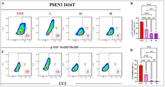 PSEN 1 I416T ChLNs treated with the combination of TM, CU, and SP at low (5, 1, 0.1), middle (10, 2, 0.2), and high (50, 10, 1) concentrations (μM) significantly reduce the phosphorylation of TAU and the activation of the apoptotic marker cleaved caspase 3 (CC3). PSEN1 I416T MenSCs were transdifferentiated and subjected to combined treatments of SP, TM, and CU for 4 days at low (L), middle (M), and high (H) concentrations following the protocols outlined in the Materials and Methods section. (A) Representative density plot illustrating the percentage of p-TAU Ser202/Thr205 as determined by flow cytometry. (B) Quantification of the percentage of p-TAU Ser202/Thr205 -positive cells. (C) Representative density plot depicts the percentage of CC3-positive cells. (D) Quantification of the percentage of CC3-positive cells. Figures represent one of three independent experiments (n = 3). The results are reported as the mean ± standard deviation of 3 independent experiments. Statistical analysis involved a one-way ANOVA followed by Tukey’s test. Statistically significant variations are indicated by ** p < 0.01, *** p < 0.001, and ns = no significance.