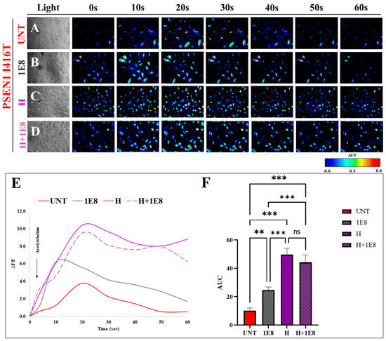 With a few modest adjustments, changes in the intracellular calcium (Ca2+) concentration brought on by cholinergic stimulation were assessed in accordance with the references [98,99]. The measurement was performed using the fluorescent dye Fluo-3 (Fluo-3 AM; Thermo Fisher Scientific, cat: F1242, Waltham, MA, USA). DMSO (1 mM) was used to dissolve the dye and create a stock solution. The stock solution was diluted in neuronal buffer solution [98,99] prior to the tests. The dye’s working concentration was 2 μM. PSEN1 I416T ChLN cells were treated with the dye-containing NBS for 30 min at 37 °C. This was followed by five washings. On the fourth day post-transdifferentiation, acetylcholine (ACh, final concentration 1 mM) induced intracellular Ca2+ transients. Measurements were taken with the microscope’s 20× objective. The visual field of the camera was divided into multiple areas of interest (ROIs). The fluorescence intensity measured in one of the ROIs—which was cell-free—was regarded as background fluorescence (Fbackground). Pseudocolorescent was used to depict the fluorescence intensities (and consequently, Ca2+ levels) in relation to the recorded time dependency of fluorescence emission. The resting fluorescence intensities (Frest) from ROIs containing cells were calculated as the average of points recorded during a consecutive 10 s period prior to acetylcholine addition. The value of Fbg was obtained from the cell-free ROI in order to calculate changes in average fluorescence intensities related to Ca2+. Peaks of fluorescence transients were found by averaging six consecutive points and identifying those points that yielded the highest average value (Fmax). The amplitudes of Ca2+-related fluorescence transients were expressed relative to resting fluorescence (ΔF/F) and calculated using the following formula: ΔF/F = (Fmax − Frest)/(Frest − Fbg). Fluorescence intensity was calculated using ImageJ. The term “fluorescence intensity” was used as an indirect indicator of intracellular Ca2+ concentration. The evaluation was repeated three times in independent, experimenter-blind experiments.