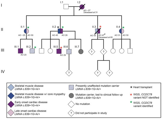 The pedigree of a family with dominant skeletal muscle and cardiac disease is shown. AO, age at onset (years) for skeletal muscle disease on the left and cardiac disease on the right; #, LVEF of the individual reduced to 35% upon initial examination and age of onset is presumed to be earlier than reported.