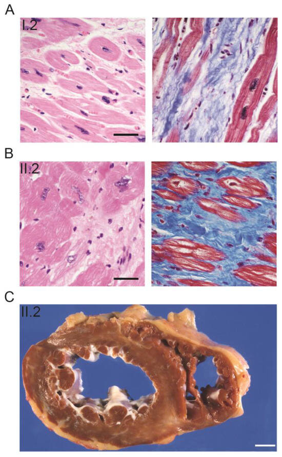 Cardiac pathology of two family members with heart failure. (A) Photomicrographs of cardiac tissue from the autopsy of I.2 stained with hematoxylin and eosin (left) and Masson trichrome (right); illustrates myocardial fibrosis, hypertrophic cardiomyocytes, and large, pleomorphic myocyte nuclei. (B) Photomicrographs of tissue from the explanted heart from individual II.2; illustrates features of chronic heart failure like individual I.2. Scale bar for all photomicrographs = 50 µm. (C) Gross photograph of the explanted heart from individual II.2; depicts ventricular dilation and scarring of the left ventricular wall and interventricular septum (grey–white regions within the dark brown cardiac muscle). Scale bar = 1 cm.