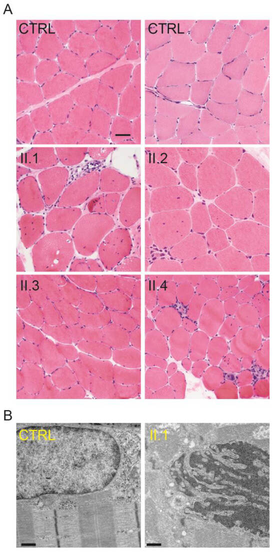 2.2. Skeletal Muscle Pathology of the Four Generation II Siblings Contains Dystrophic Features