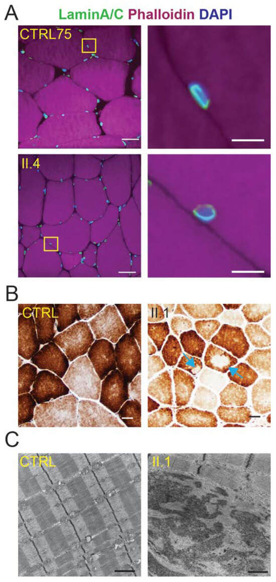 Skeletal muscles from affected family members show the anticipated localization of nuclear envelope proteins; however, profoundly affected individuals have muscle cores. (A) Skeletal muscle biopsies from patient II.4 and an unrelated control (CTRL75) stained with an antibody against lamin A/C showed the anticipated localization at the nuclear periphery. The enlarged region of the full images is indicated by the yellow box. Scale bar on full images = 30 µm, Zoomed images = 5 µm. (B) Individuals profoundly affected with skeletal muscle disease such as II.1 show cytoplasmic regions of pallor with cytochrome C oxidase (COX)-staining, indicated by the blue arrows. The lack of staining indicates areas devoid of mitochondria which are known as muscle cores. Scale bar = 50 µm. (C) Electron microscopy of skeletal muscle biopsy tissue from individual II.1 depicts the regional disruption of skeletal muscle sarcomeric ultrastructure, including Z banding, which is indicative of muscle cores. Such disorganization was not observed in muscle from a control individual (CTRL). Scale bar = 1 µm.