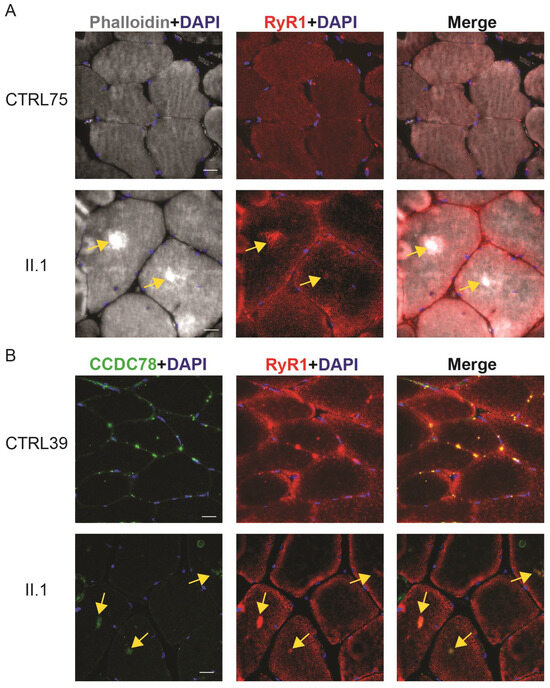 In CCDC78-associated congenital myopathy, muscle cores that show aggregates of CCDC78 also contain aggregates of RyR1 [74]. To determine if the muscle biopsies from the individuals with the CCDC78 variant also have aggregates of RyR1, we stained muscle cryosections with antibodies to RyR1 and phalloidin (Table S1). Muscle biopsy tissue from individual II.1 showed the presence of muscle cores as marked by areas of discoloration in the phalloidin staining and intense staining of RyR1 antibodies in these cores (Figure 8A). These features were absent in control muscle tissue (Figure 8A). A double stain of muscle tissue with antibodies against RyR1 and CCDC78 confirmed colocalization of these two proteins in muscle tissue from individual II.1 (see signal overlap in Figure 8B). These antibodies did not show overlap in an unrelated control (Figure 8B). Additionally, muscle biopsy tissue from individual II.3 also showed wild-type localization of CCDC78 and RyR1, demonstrating the specificity of RyR1 accumulation for those family members possessing muscle cores and the CCDC78 variant (Figure S4). RYR1 mutations are the most common cause of core myopathy [50,74]. It is important to note that we did not find RYR1 DNA sequence variants in the family members in this study who underwent WGS. This indicates that mislocalization of RyR1 observed in the muscles of these individuals with the LMNA mutation and CCDC78 variant is not due to a pathogenic variant in RYR1, indicating that the CCDC78 variant is a likely cause of the muscle core pathology.