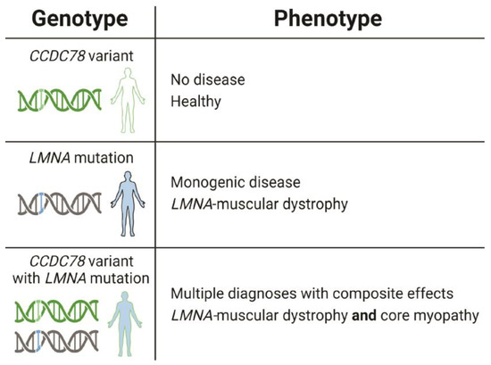 In conclusion, our data suggest that the skeletal muscle abnormalities in this family represent two diseases caused by two distinct DNA sequence changes in two different genes. The rare LMNA mutation in this family causes LMGD1B; however, it does not account for the muscle core pathology. The relatively common CCDC78 in this family segregates with core myopathy and the more profound skeletal muscle weakness and wasting (Figure 9). Our results provide additional insight into the variability associated with LMNA-MD by supporting the hypothesis that the wide phenotypic spectrum of LMNA-MD is at least in part driven by DNA sequence variants in the genetic background of affected individuals [16,42,43,44,45]. Identification of these additional genetic variants that contribute to the skeletal muscle pathology can aid in diagnosis and prognostic predictions, be used to stratify individuals in clinical trials, and offer new potential targets for therapy.