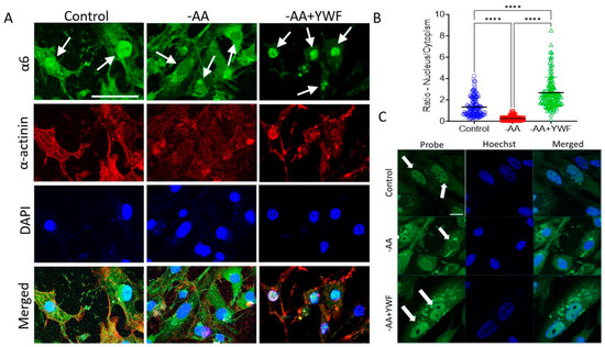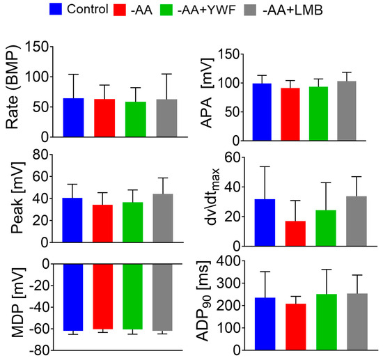 As demonstrated in Figure 3, the AA-deficient treatment (i.e., both -AA and -AA+YWF) did not affect the action potential characteristics. Since overall these characteristics and especially maximal diastolic depolarization (MDP) are affected by the ATP-dependent Na/K-ATPase activity, and are therefore sensitive to the CM bioenergetic and metabolic status, we concluded that these treatments did not adversely affect cell viability.