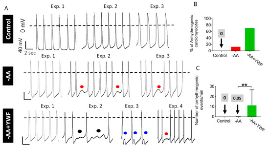 Amino acid-deficient media cause arrhythmias in iPSC-CMs (CMs). (A) Representative action potentials recorded from spontaneously firing CMs cultured for 2 days in control (complete medium), -AA and -AA+YWF. The treated CMs contain both regular (left-hand traces) and arrhythmogenic action potentials. Arrhythmias are presented as skipped beats (red symbols), oscillatory pre-potentials (black symbols) and delayed afterdepolarizations (DADs, blue symbols). (B) The percentage of arrhythmogenic CMs in control, -AA and -AA+YWF. An arrhythmia is defined as a minimum of three arrhythmogenic events. (C) The occurrence of arrhythmias, defined as the mean number of arrhythmogenic events/minute. In the -AA bar, the mean ± SD are 0.0514 ± 0.146. Statistical analysis was performed by means of the Kolmogorov–Smirnov normality test followed by the Mann–Whitney test; ** p < 0.01. Control, n = 11 CMs; -AA, n = 9 CMs; -AA+YWF, n = 37 CMs.