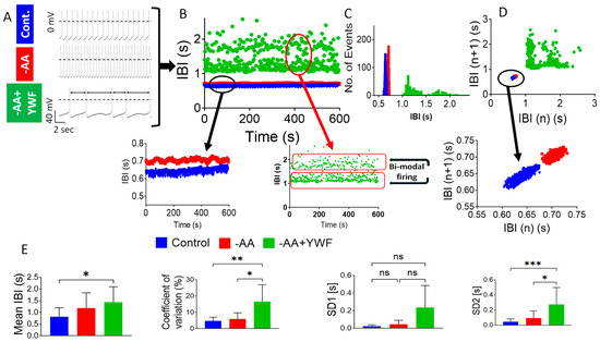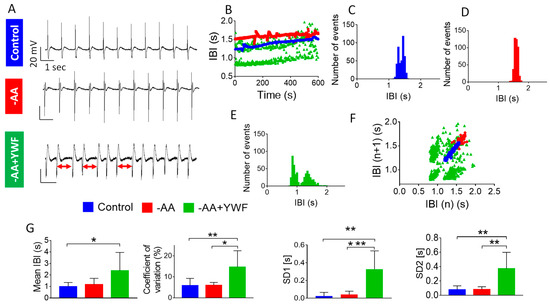 To strengthen the single-cell-level findings, we recoded extracellular electrograms from beating CM clusters/networks using the microelectrode array (MEA) setup (Figure 5). Panels A–E depict representative extracellular electrograms (A), IBIs versus time plots (B), and IBIs histograms from the control (C), -AA (D) and -AA+YWF (E) CMs, respectively. Similar to the single-cell findings, at the network level, the -AA+YWF group displayed a bimodal firing pattern (Figure 5B; see two green clouds), two-peak compared to one-peak IBIs histogram plots (Figure 5E) and a Poincaré plot composed of the theoretically expected four discrete clouds (Figure 5F) [24]. Accordingly, in the -AA+YWF group the BRV measures CV, SD1 and SD2 were larger than the control and the -AA group (Figure 5G), once again corroborating the prominent arrhythmogenic nature of the -AA+YWF treatment, at the single-cell level as well as at the network level.