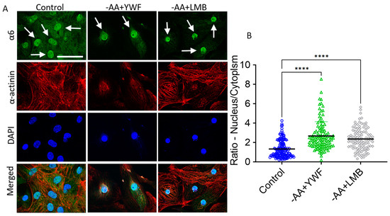 Two-day treatment of iPSC-CMs (CMs) with -AA+Leptomycin B (LMB, 5 ng/mL, an inhibitor of exportin1) recapitulates the effects of -AA+YWF on proteasome intracellular distribution. CMs were cultured for 2 days in control (complete medium), -AA or -AA medium supplemented with LMB (-AA+LMB). (A) Representative immunofluorescence images from the three experimental groups; green: staining of the proteasome α6 subunit; red: staining of the cardiac marker α-actinin; blue: DAPI staining of the nucleus. In control, the proteasome is mostly concentrated in the nucleus, whereas in -AA+YWF and -AA+LMB the proteasome nuclear signal is markedly augmented. Clone: FSE; scale bar = 50 μm. The white arrows point to the nucleus. (B) A summary showing the ratio between the proteasome α6 subunit density in the nucleus and cytoplasm, N/C. In each cell, the density was defined as signal intensity divided by the respective areas of the nucleus and cytoplasm. The confocal fluorescent images were analyzed using ImageJ quantification tool (see details in Section 4: Materials and Methods). Statistical analysis was performed by means of the Kolmogorov–Smirnov normality test followed by the Kruskal–Wallis test; **** p < 0.0001. Control, n = 103 CMs; -AA+YWF, n = 113 CMs; -AA+LMB, n = 101 CMs.