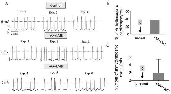 Leptomycin B (LMB, 5 ng/mL) prevents the translocation by -AA of the proteasome from the nucleus to the cytoplasm (-AA+LMB) and causes arrhythmias. (A) Representative action potentials recorded from spontaneously firing iPSC-CMs cultured in control (complete medium, 3 experiments) and in -AA+LMB (6 experiments); arrhythmias are shown in all 6 experiments. (B) Analysis of the arrhythmias caused by 2-day treatment with -AA+LMB medium versus control. The percentage of arrhythmogenic cardiomyocytes in control and -AA+LMB. (C) The occurrence of arrhythmias: the mean number of arrhythmic events/minute in each group. Statistical analysis was performed by means of the Kolmogorov–Smirnov normality test followed by the Mann–Whitney test between the control and -AA+LMB; p = 0.0568. Control, n = 8 CMs; -AA+LMB, n = 13 CMs.