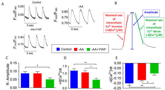 Ca2+ transients in control (complete medium) and in iPSC-CMs (CMs) treated for 2 days with -AA or -AA +YWF. (A) Representative Ca2+ transients from the three experimental groups. (B) A scheme illustrating the Ca2+ transient characteristics analyzed. (C) Ca2+ transient amplitude (R-Amplitude). (D) Maximal rate of [Ca2+]i rise (+d[Ca2+]i /dt). (E) Maximal rate [Ca2+]i decay (−d[Ca2+]i /dt. Statistical analysis was performed by means of the Kolmogorov–Smirnov normality test, followed by one-way analysis of variance (ANOVA) and Tukey post hoc test; * p < 0.05, ** p < 0.01. Control, n = 8 clusters; -AA, n = 7 clusters; -AA+YWF, n = 9 clusters.