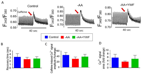 Another key feature of the Ca2+ handling machinery is the ability of the sarcoplasmic reticulum (SR) to release Ca2+ in response to a brief caffeine (a RyR opener) application (Figure 9) [33,34]. In agreement with our previous reports [34,35], caffeine caused an abrupt increase in the Ca2+ transient amplitude, followed by a decline in the intracellular Ca2+ levels along with the resumption of the transients within several seconds (Figure 9A) [34,36]. To quantify the response to caffeine, we calculated three parameters: (i) the mean recovery time—the time from the peak of caffeine-induced intracellular Ca2+ rise to the first measurable Ca2+ transient; (ii) the percent change in caffeine-induced Ca2+ transient amplitude, compared to the pre-caffeine amplitude; and (iii) the fold change in the area of the caffeine-induced Ca2+ transient, compared to the pre-caffeine Ca2+ transient area. The summary of these experiments shows (Figure 9B–D) that caffeine caused a similar effect in the three groups, demonstrating that the AA-deficient treatments were not harmful to the CMs. The findings presented in Figure 8 and Figure 9 suggest that: (i) the decline in the Ca2+ transient characteristics in the -AA+YWF group could result from smaller SR Ca2+ stores; (ii) the caffeine-induced Ca2+ release machinery is intact in the -AA and -AA+YWF groups.